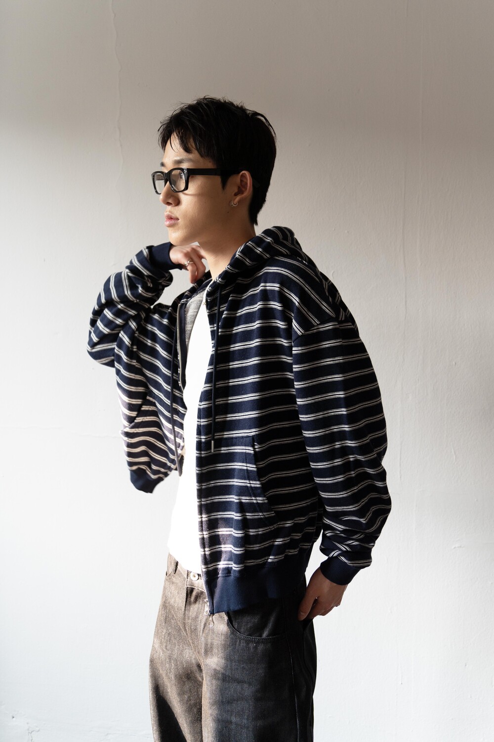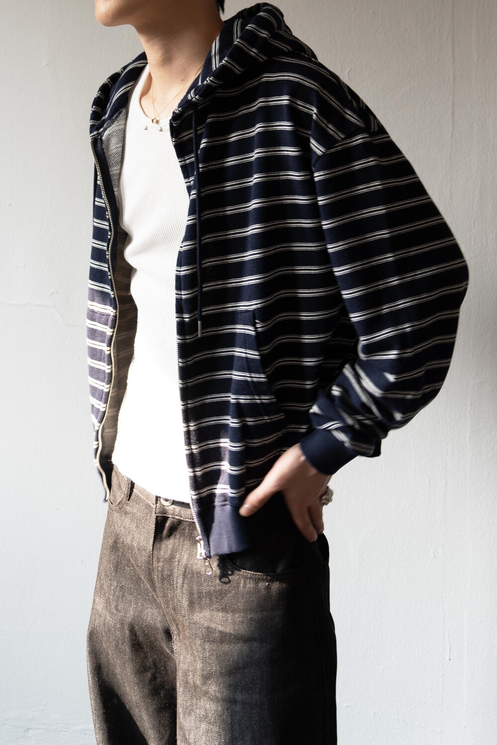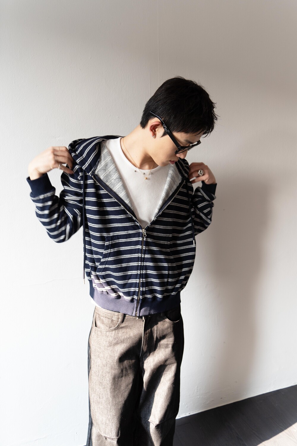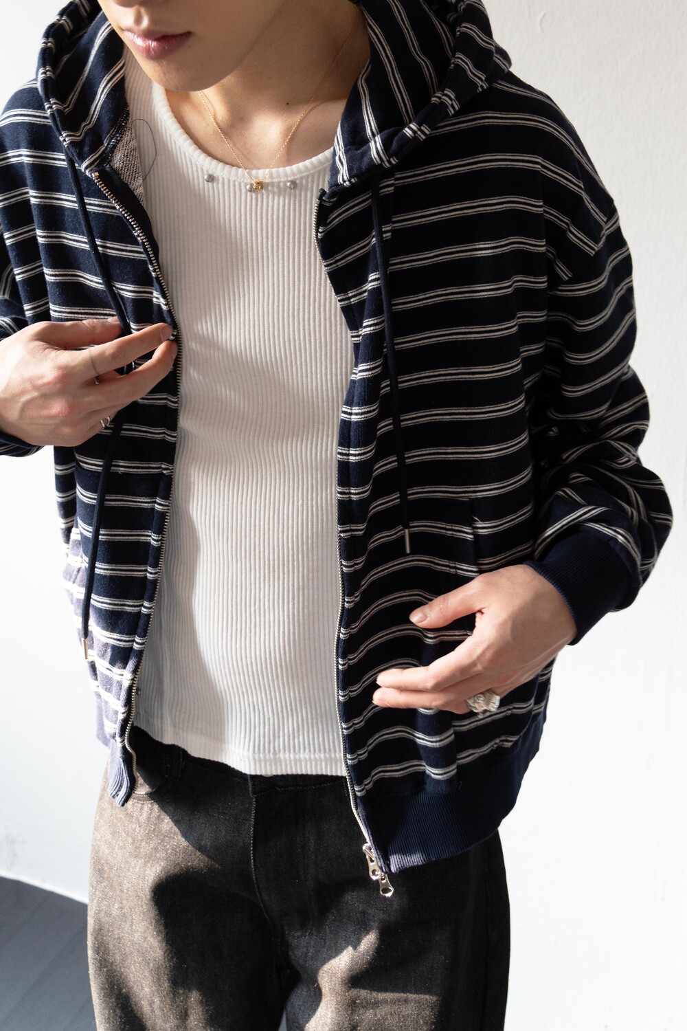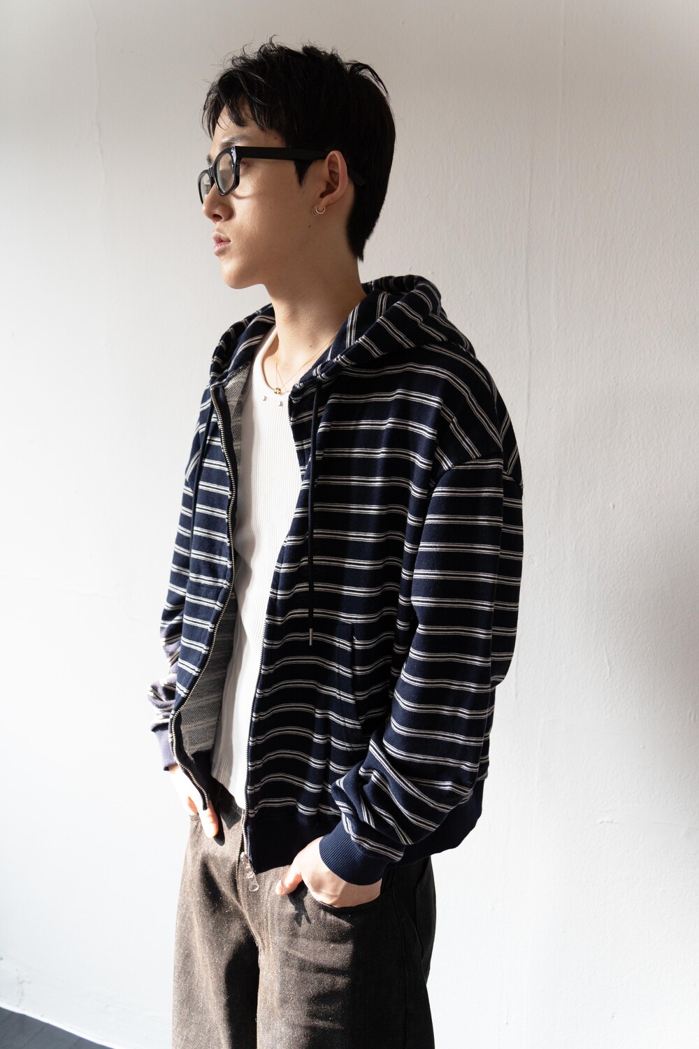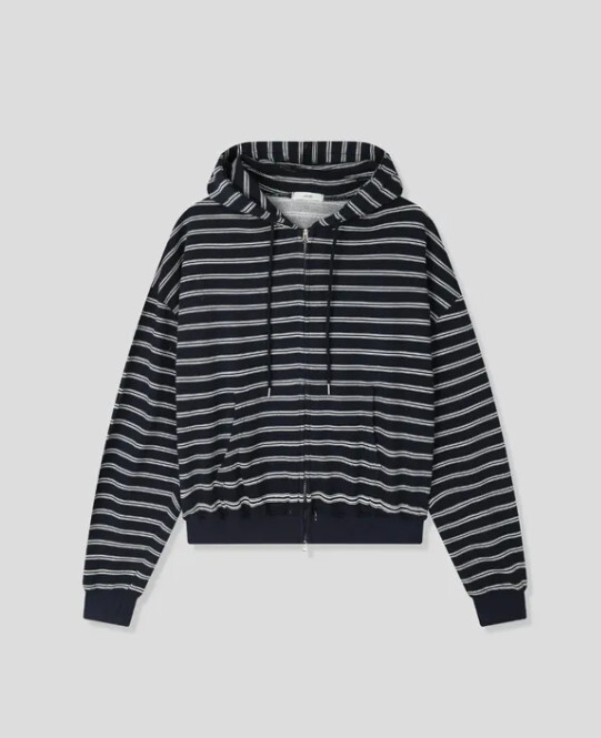 캐주얼한 스트라이프 패턴이 매력적인 집업 후디입니다.