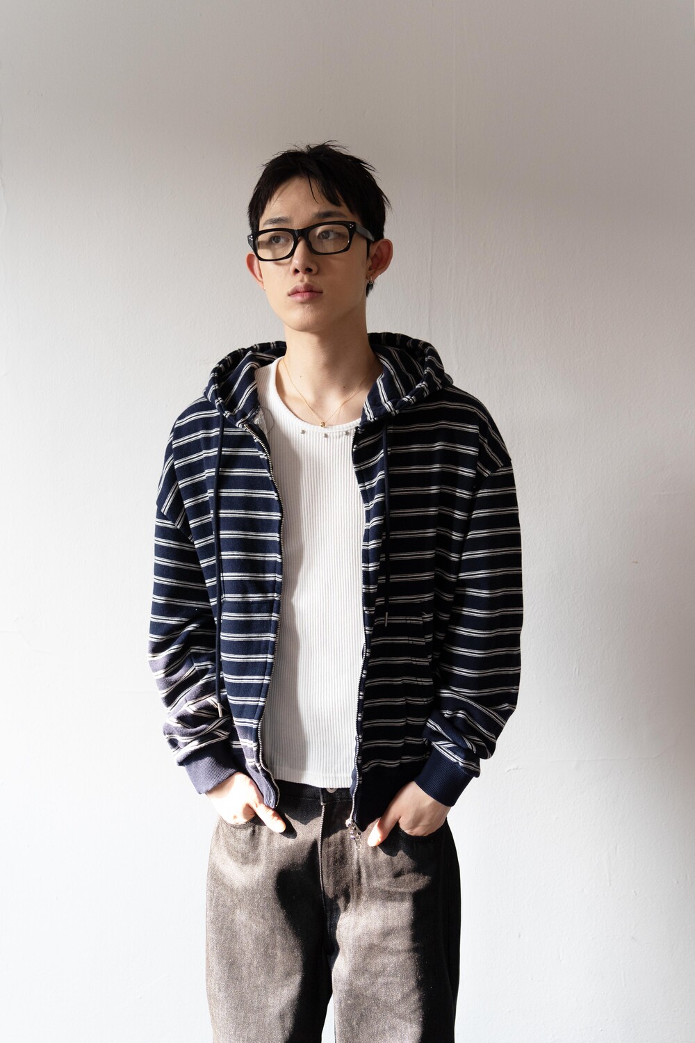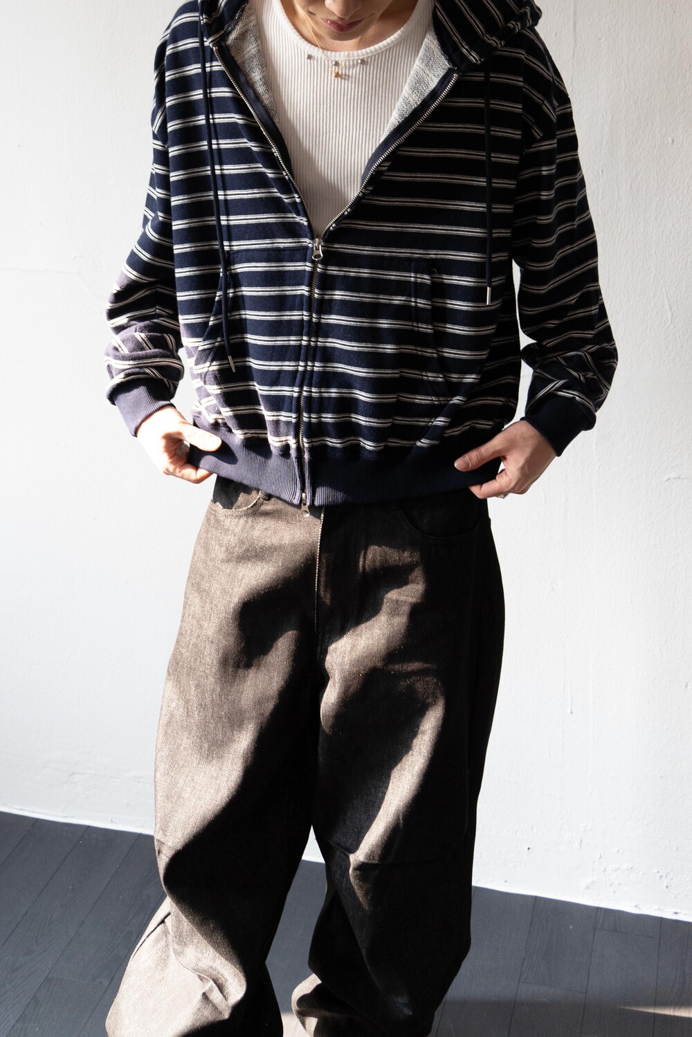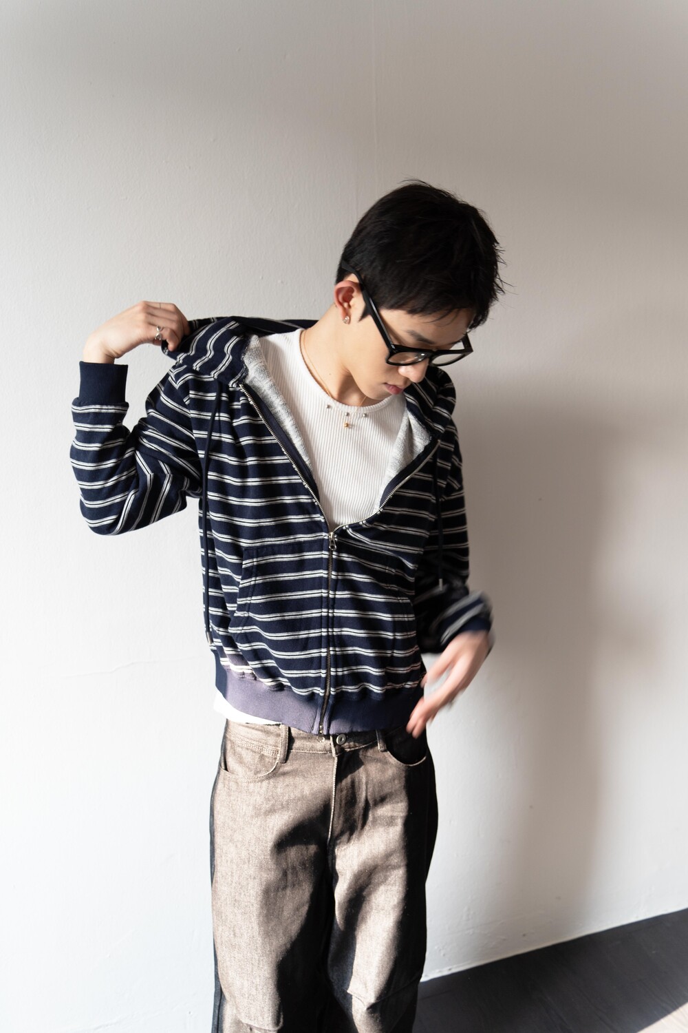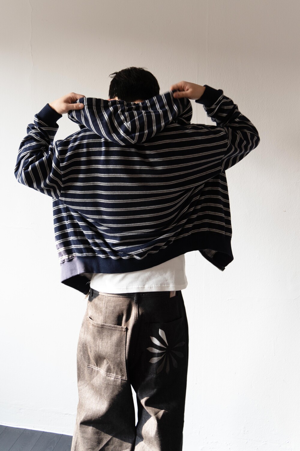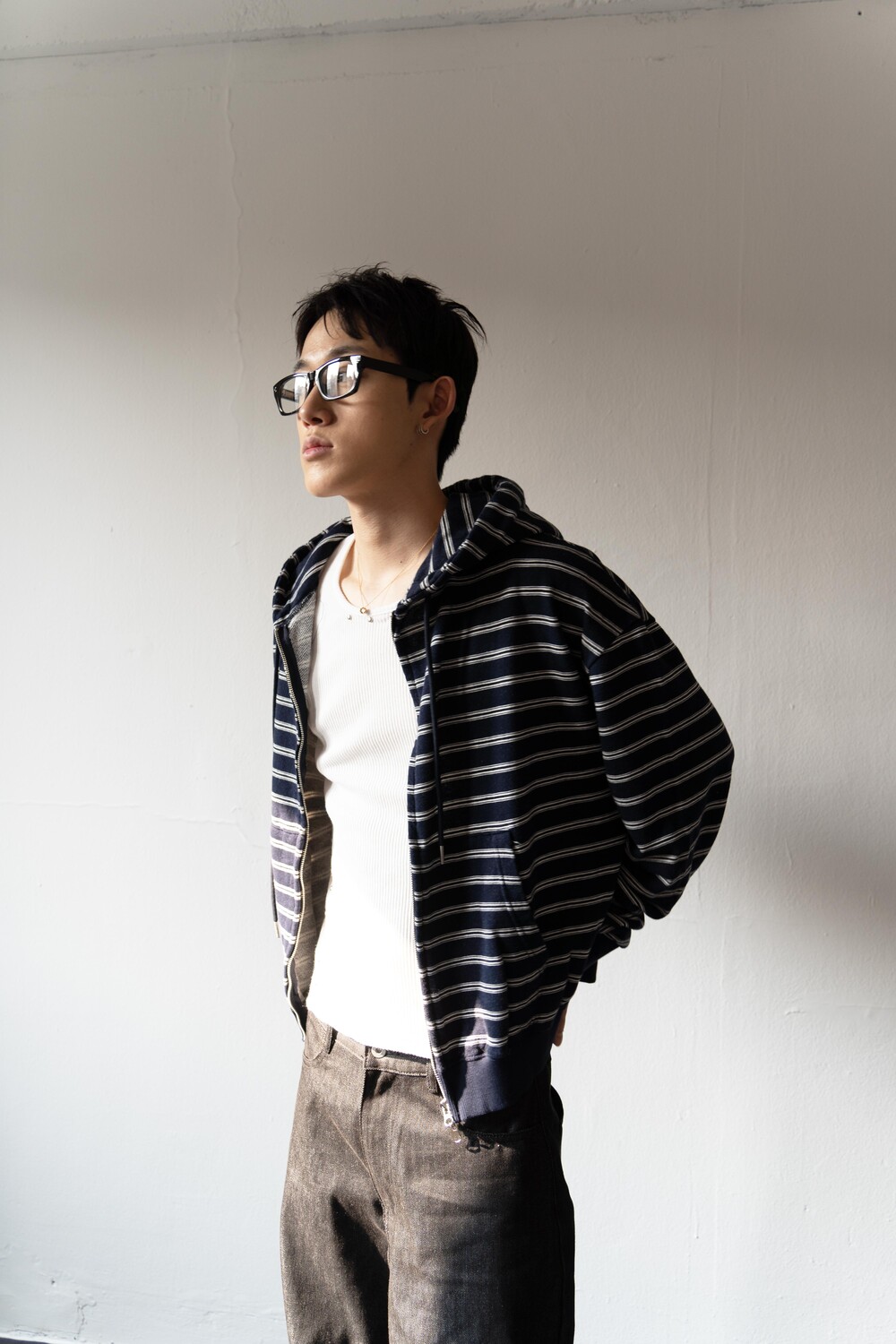 캐주얼한 스트라이프 패턴이 매력적인 집업 후디입니다.