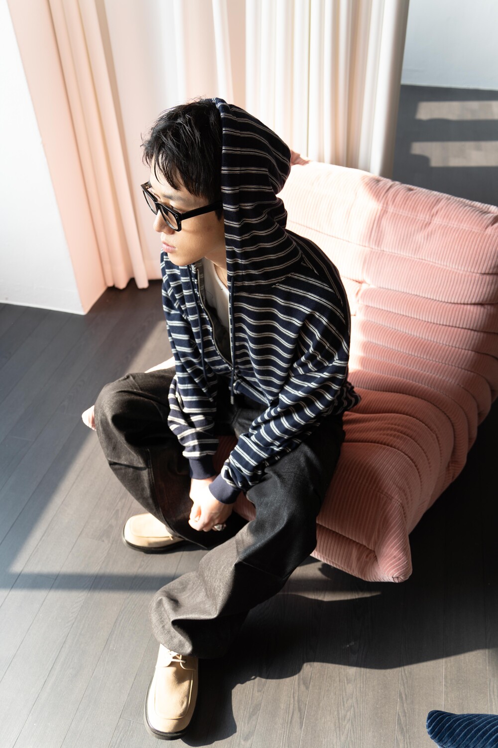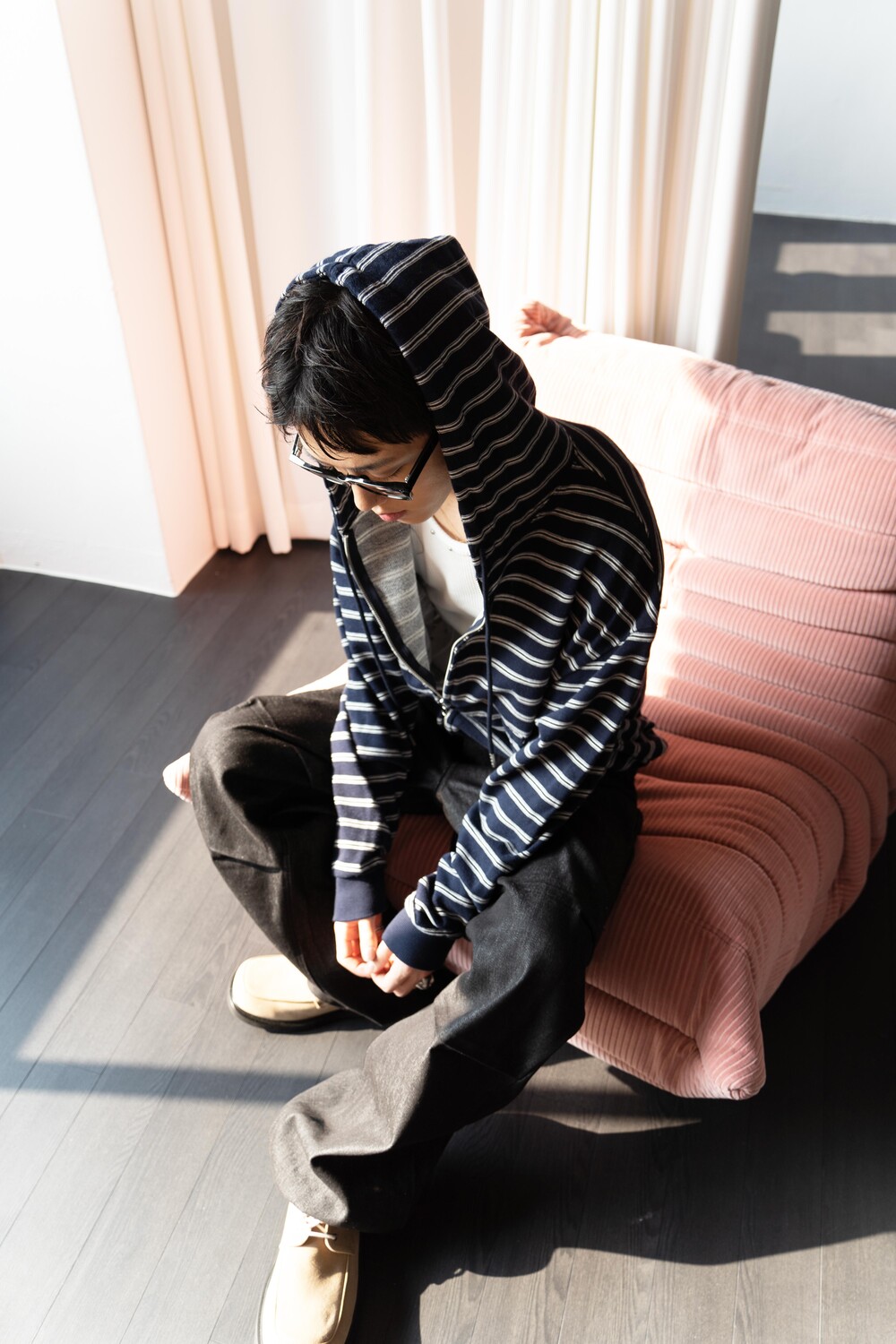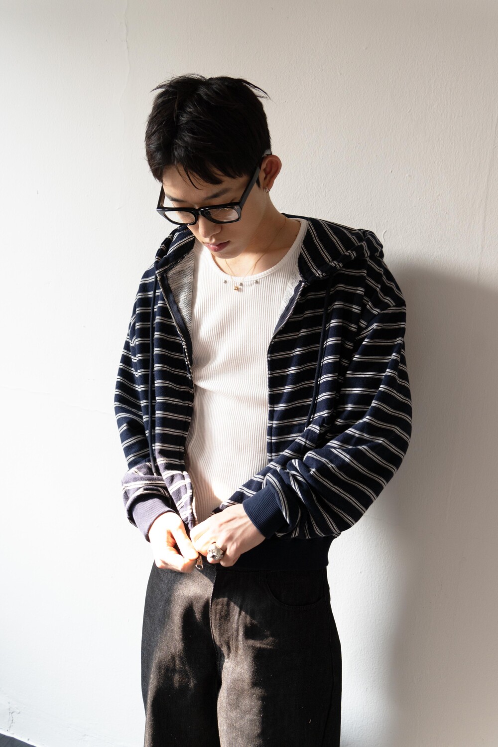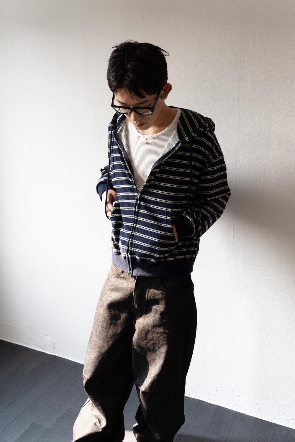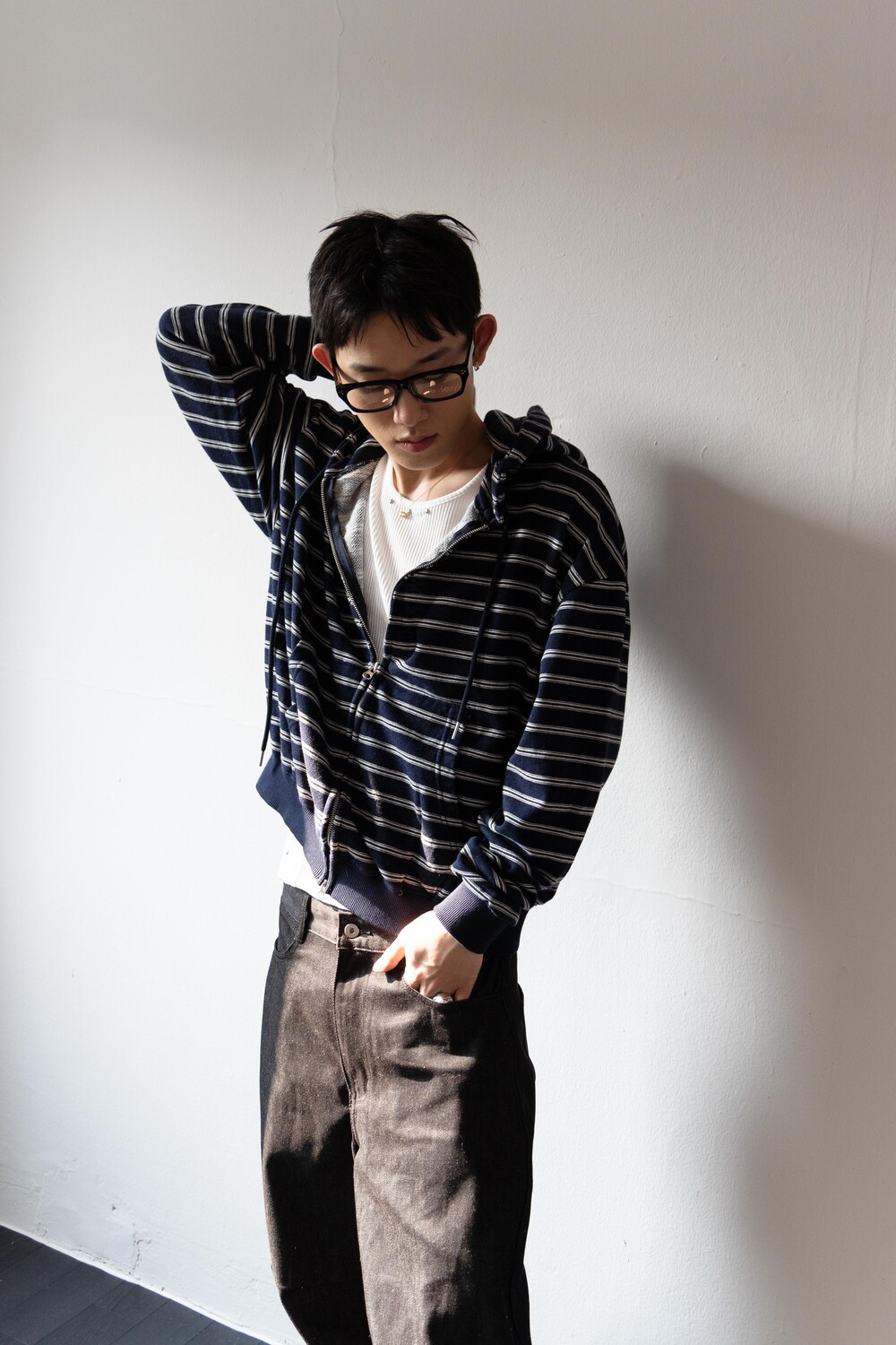 캐주얼한 스트라이프 패턴이 매력적인 집업 후디입니다.